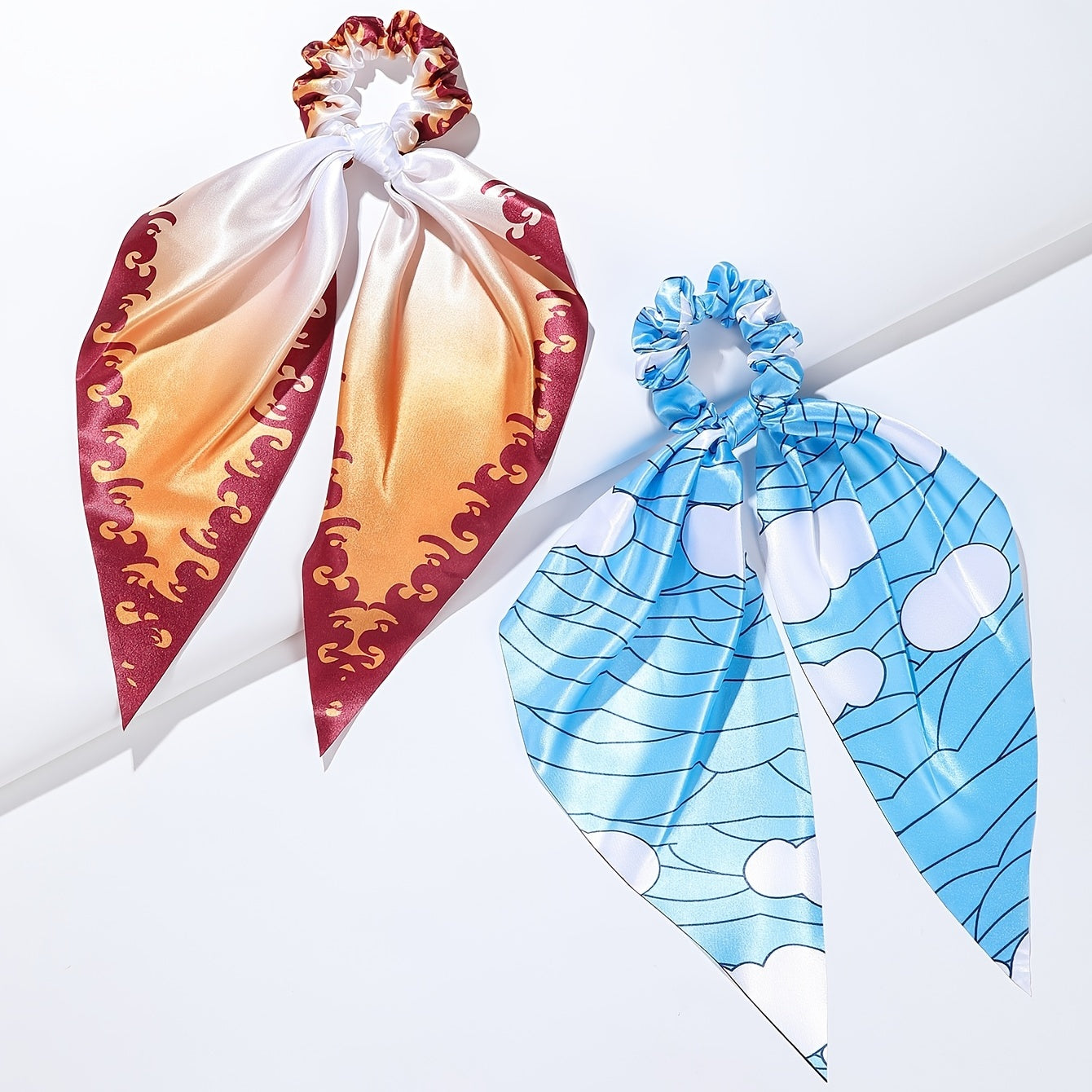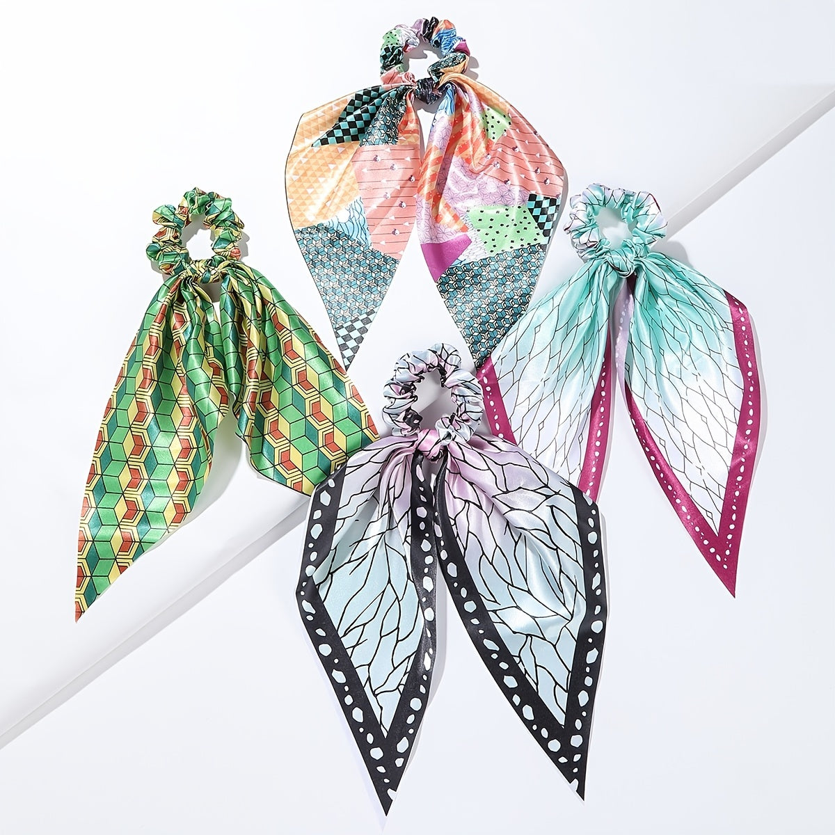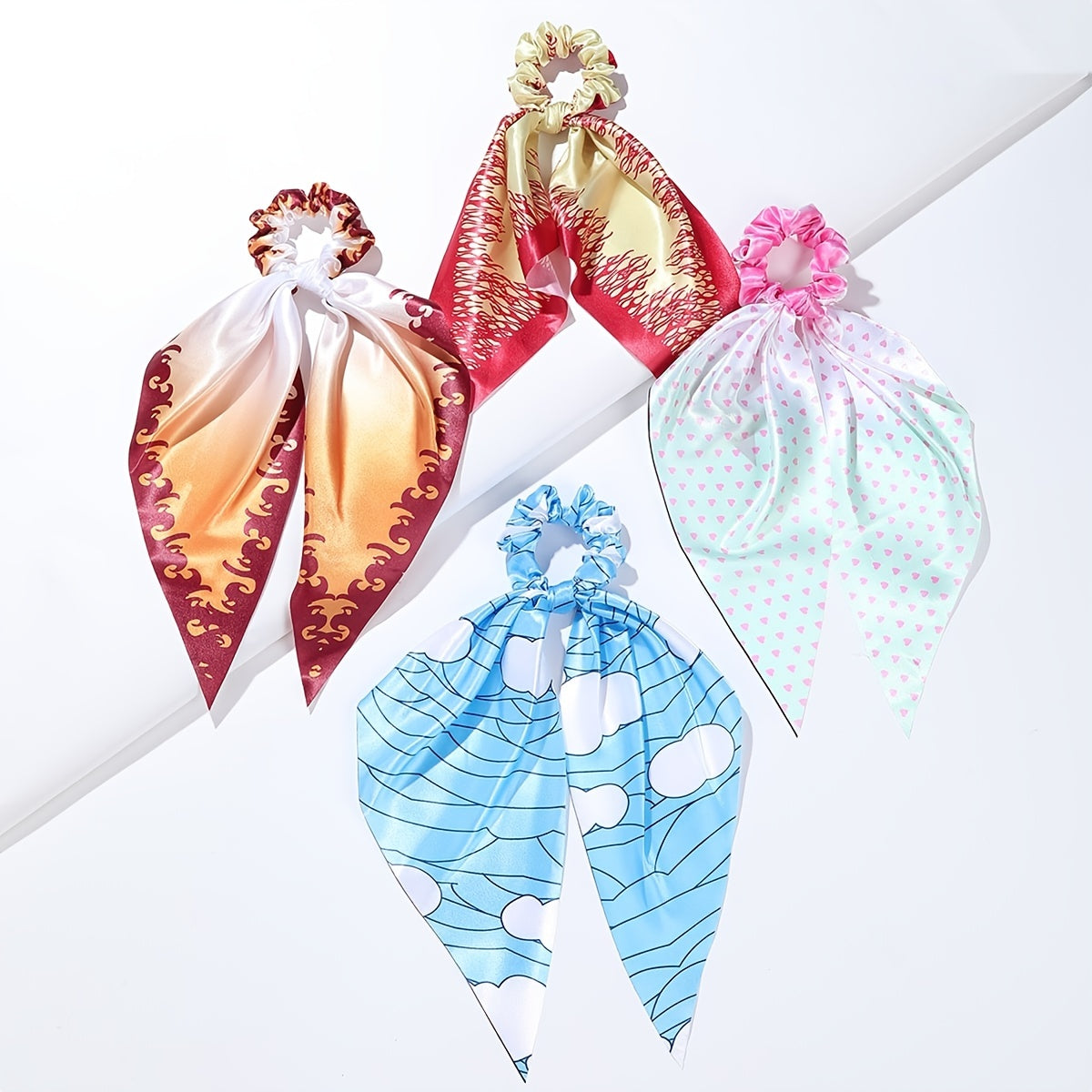 4pcs Adorable Japanese Anime Cartoon Printed Fabric Bowknot Hair Scarves with Elastic Hair Ties for Women - Soft, Comfortable, and Easy to Wear Ponytail Holders for Various Hairstyles - Cute Hair Accessories for Anime Fans