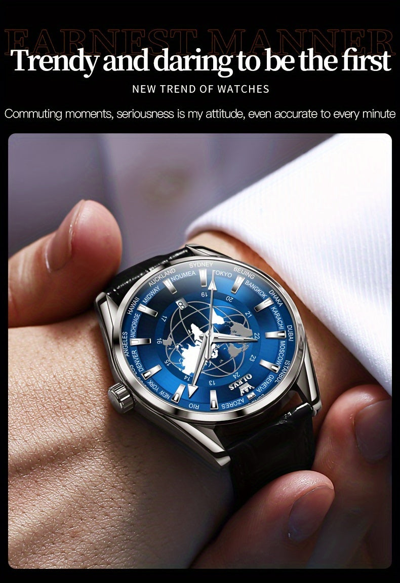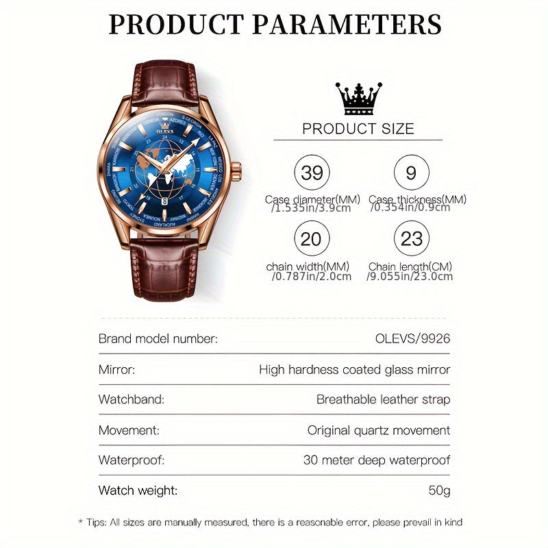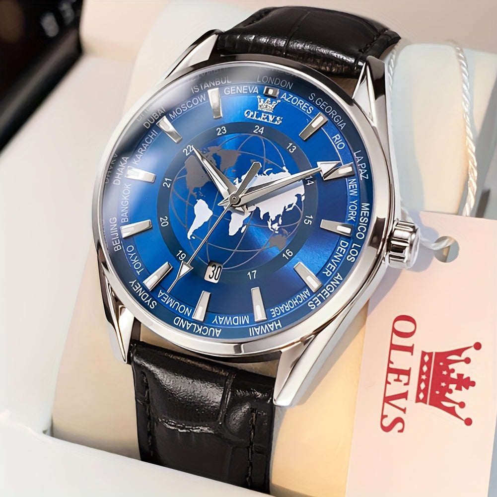 OLEVS Men's Watches Brown Leather With Date, Casual Watches For Men, Blue Globe Face Watches Men, Chronograph Men's Watch, Sport Waterproof Business Dress Analog Quartz Men's Wrist Watches Relojes De Hombre